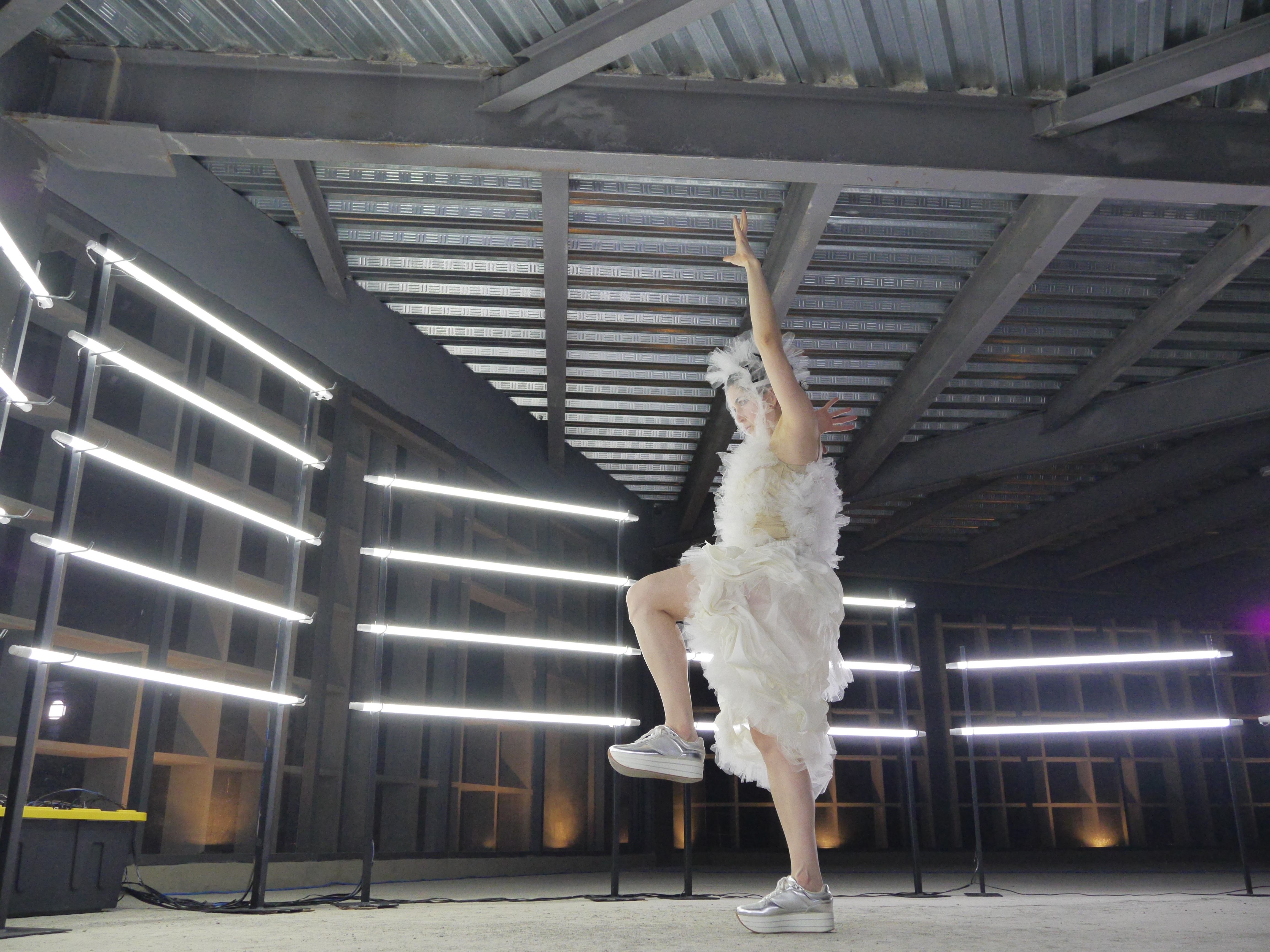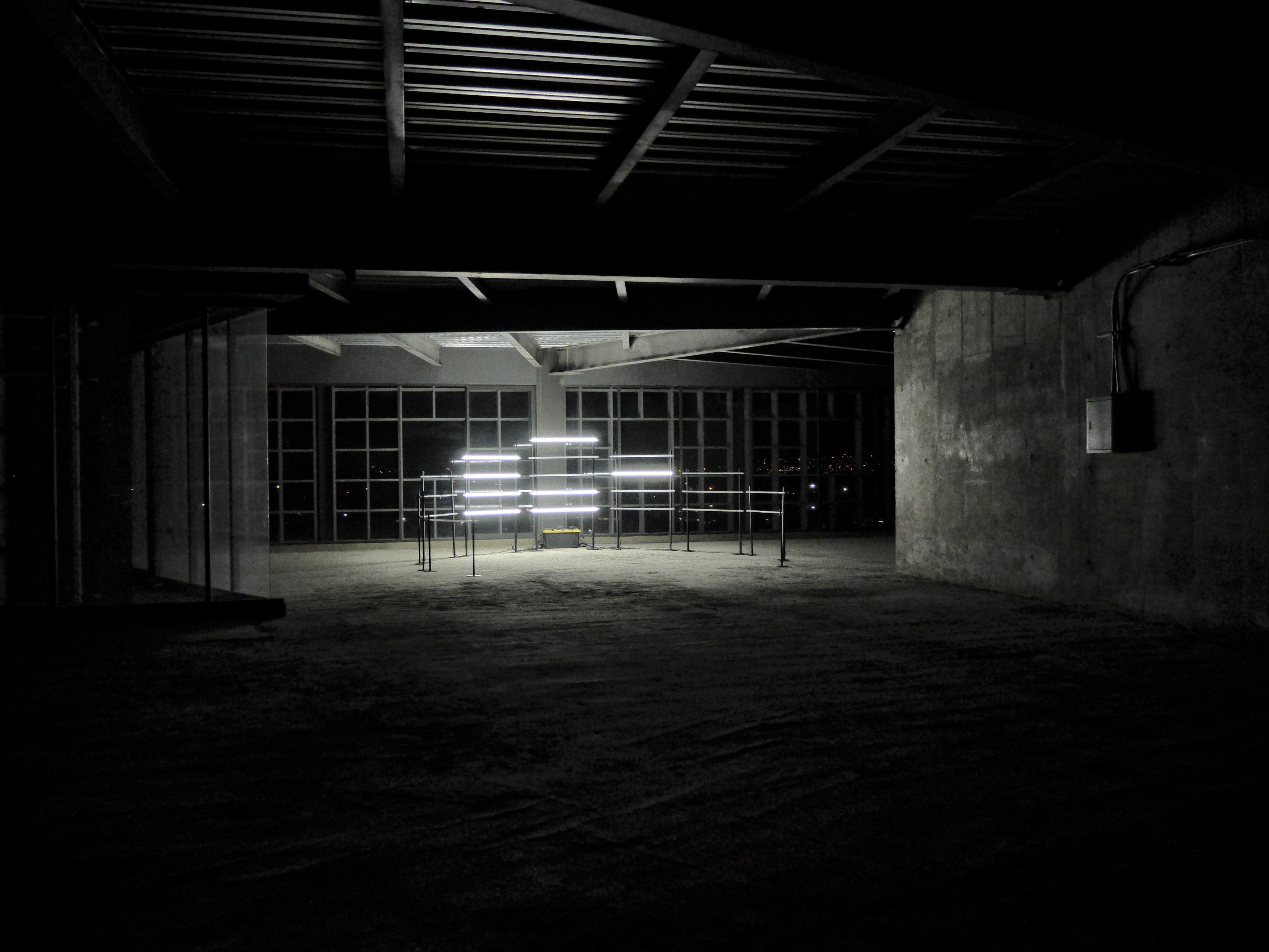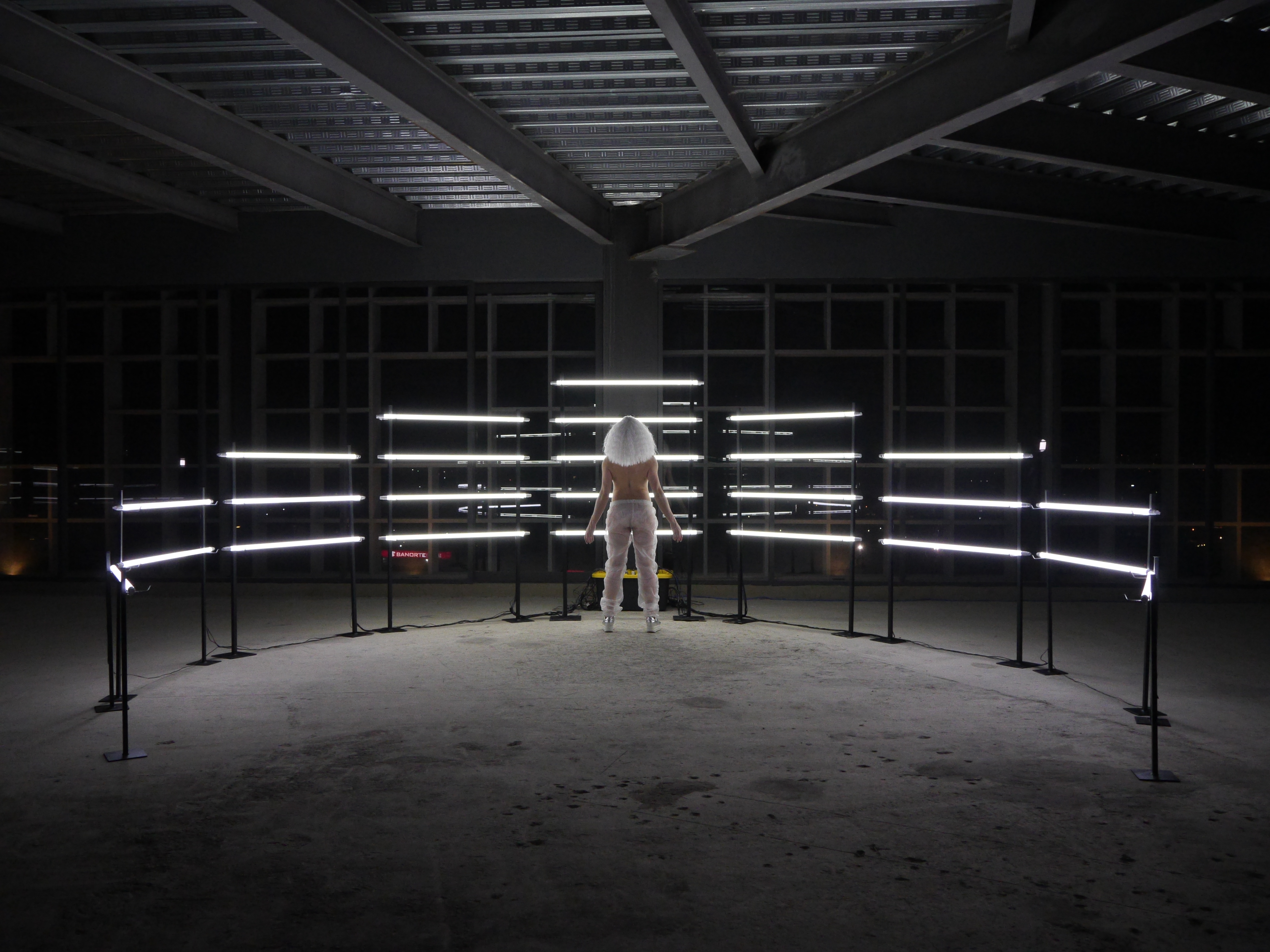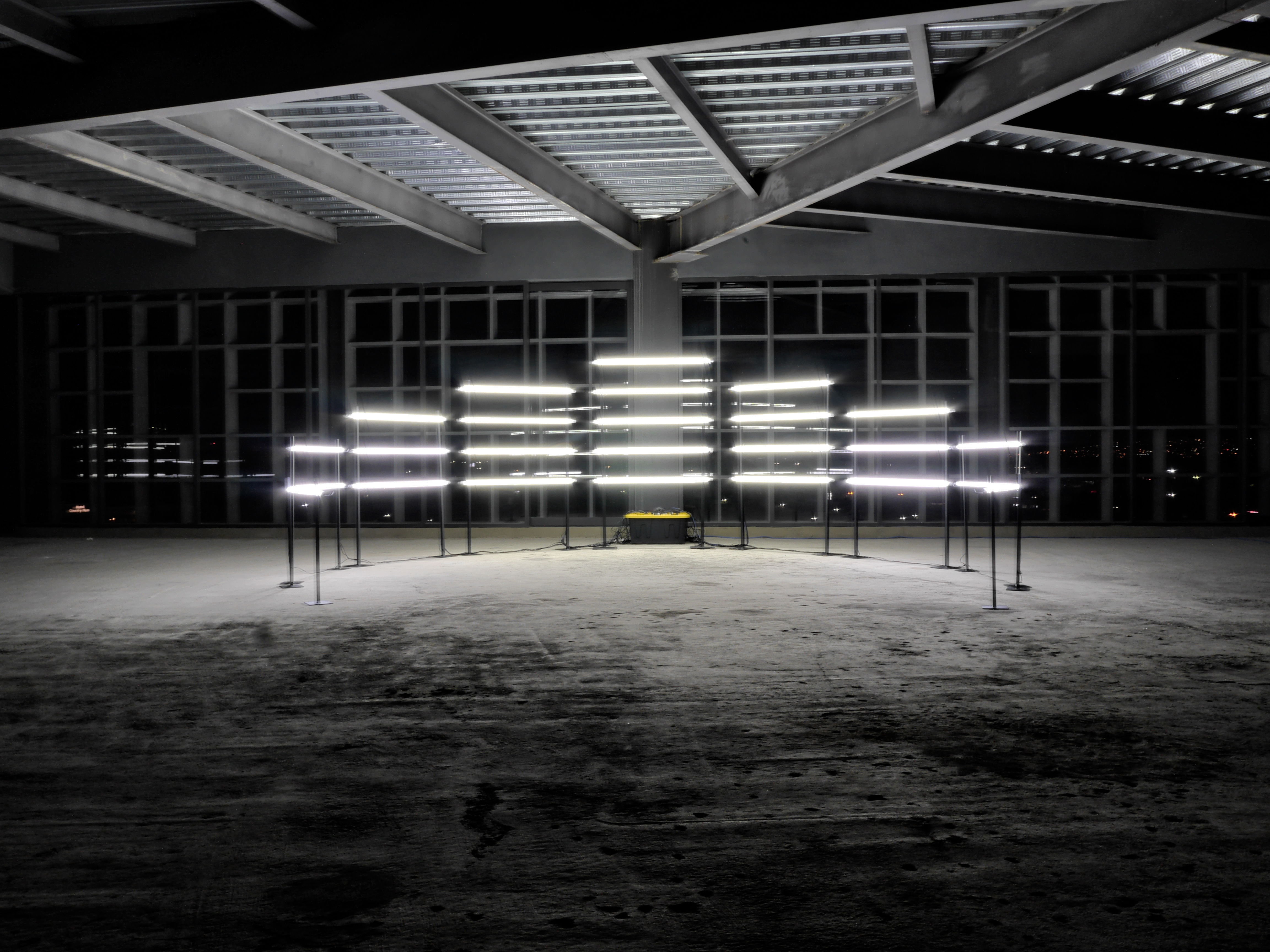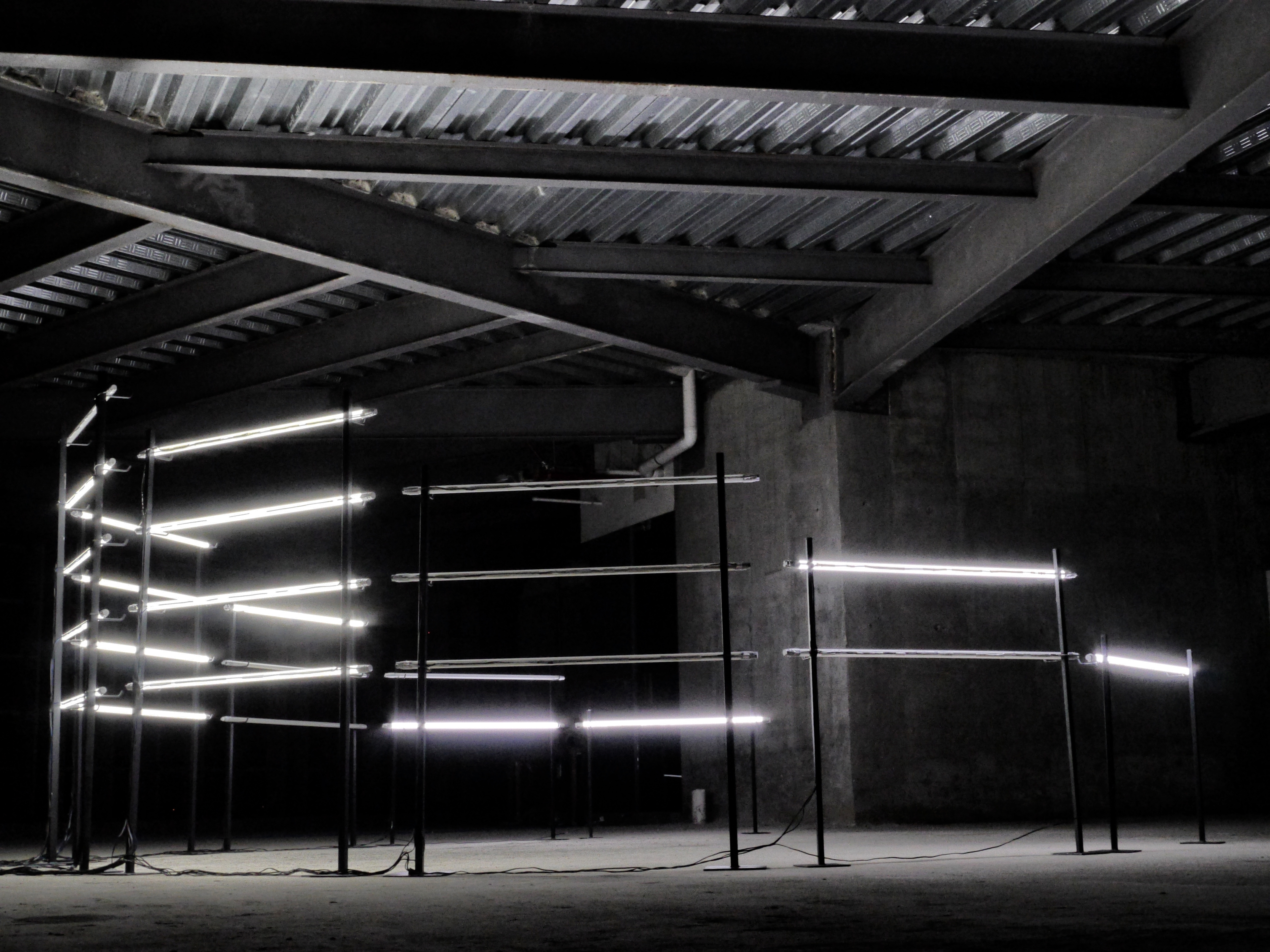 The installation consists of 25 opaline led tubes held horizontally on iron racks placed in a semi circle, with several light sequences programmed with the use of an Arduino system.